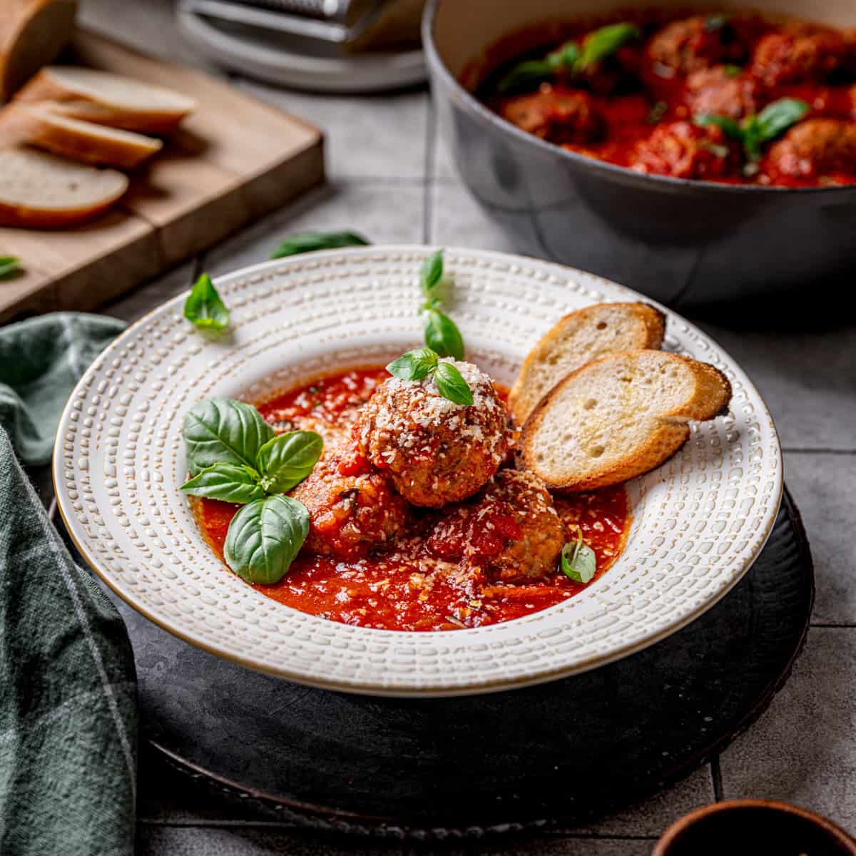 - While the meatballs are baking, heat your tomato sauce in a large pot over medium heat. Once the meatballs are done baking, transfer the cooked meatballs to the pot of sauce to finish for about 10-15 minutes. Since there is pork in the meatball, you want it to be fully cooked. Remove from the heat and serve with fresh basil, freshly grated parmigiano reggiano and some crusty bread to sop up the sauce!