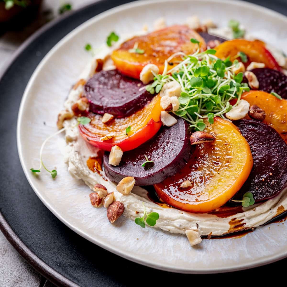 - Drizzle a few drops of aged balsamic vinegar over the beets and sprinkle with toasted hazelnuts, microgreens (optional), a little sea salt, cracked black pepper and serve!1 teaspoon aged balsamic vinegar, Toasted hazelnuts, Microgreens, Sea salt and cracked black pepper